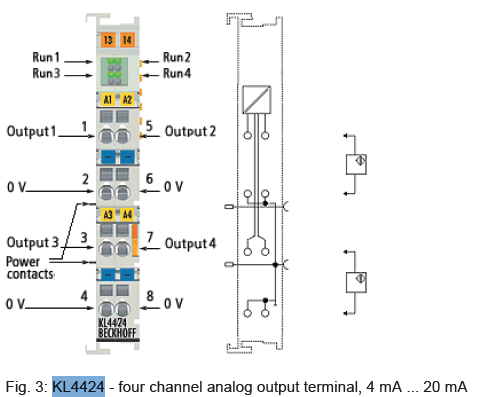 Beckhoff, модель KL4424 представляет собой шинный терминал с 4 каналами аналогового выхода, генерирующий токовые сигналы в диапазоне 4-20 мА с разрешением 12 бит. Этот модуль используется в системах автоматизации для передачи точно масштабированных аналоговых сигналов на исполнительные устройства.