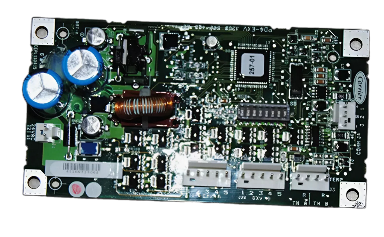 Модуль Carrier PD4-EXV является исполнительным устройством в контуре управления холодильным циклом. Его основная роль заключается в получении команд от главного контроллера системы и их преобразовании в импульсные сигналы для шагового двигателя электронного расширительного вентиля. В отличие от механических терморегулирующих вентилей, электронная система управления под руководством PD4-EXV обеспечивает гораздо более точное поддержание перегрева хладагента, что напрямую влияет на энергоэффективность холодильной машины и защиту компрессора от попадания жидкой фазы рабочего тела. Принцип работы устройства основан на алгоритмах микропроцессорного управления, которые анализируют данные о давлении и температуре в режиме реального времени. Модуль устанавливается непосредственно на монтажную панель внутри шкафа управления агрегата и подключается к общей коммуникационной шине. В конструкции платы предусмотрены защиты от перенапряжения и помех в электросети, что крайне важно для надежной работы мощных промышленных кондиционеров и холодильных установок. Интерфейс модуля позволяет проводить быструю диагностику состояния вентиля и проверять целостность обмоток шагового двигателя. Использование PD4-EXV позволяет установке гибко подстраиваться под изменяющиеся тепловые нагрузки, обеспечивая стабильную холодопроизводительность при минимальных затратах электроэнергии. Область применения включает в себя крупные офисные здания, производственные цеха и центры обработки данных, оснащенные техникой Carrier.