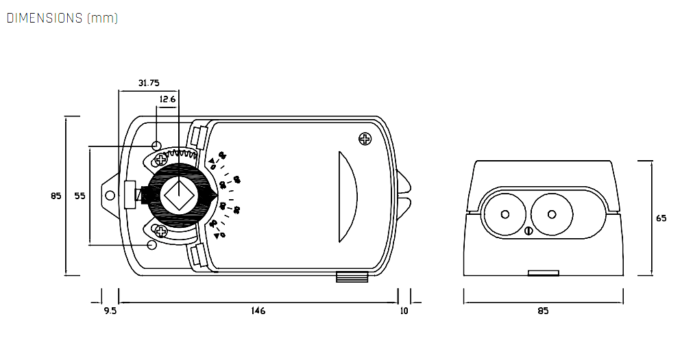 Корпус компактный 95×146×65 мм, вес 0,9 кг, температура -20...+50 °C, влажность 5-95% RH без конденсации. LED-индикаторы, ручной режим. Применяется в вентиляционных установках, фанкойлах, VAV-заслонках для пропорционального регулирования. Серия DM/DMN: 4-20 Нм, варианты DA/DM (аналоговое/3-точечное). Класс III изоляции, CE, низкий шум <45 дБ(А). Надежен для непрерывной работы.