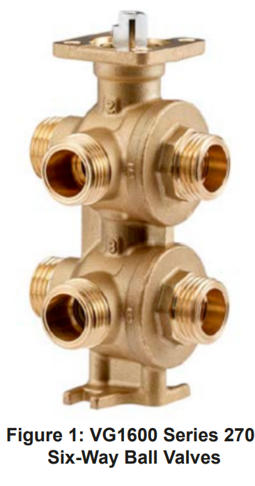 Johnson Controls VG1611AF представляет собой 6-ходовой регулирующий шаровый клапан DN15 (1/2") серии VG1600. Используется в фанкойлах, чиллер потолках и 4-трубных системах HVAC для одновременного смешивания горячей/холодной воды.