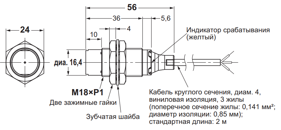 Длина резьбы 26 мм и общая длина корпуса 56 мм обеспечивают удобный монтаж не заподлицо с металлических поверхностей. Кабель стандартной длины 2 м выполнен из PVC, что повышает механическую устойчивость к повреждениям и химическим воздействиям. Датчик рассчитан на работу в температурном диапазоне от -25°C до +70°C, что существенно расширяет область его применения - от холодных производственных цехов до помещений с нормальным или повышенным тепловым режимом.
