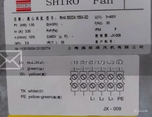 Вентилятор Shiro RHA500D4.155A-3D рассчитан на трехфазное питание 400 В переменного тока с частотой 50 Гц. Номинальный ток составляет примерно 3.1 А, что соответствует заявленной мощности 1.55 кВт. Скорость вращения рабочего колеса достигает порядка 1315 об/мин, что обеспечивает высокий уровень производительности воздушного потока при низком уровне шума.