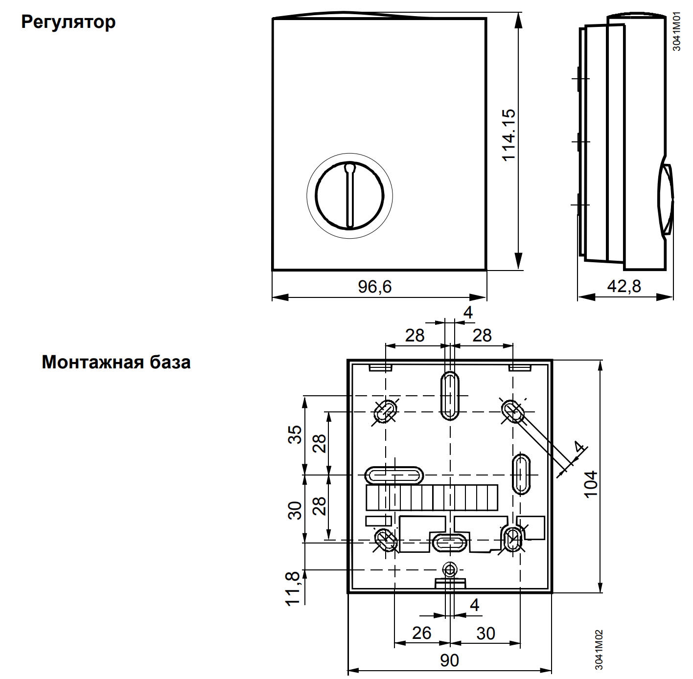 Питание 24 В переменного тока 50/60 Гц, потребление 6 ВА. Выходы: 1 триак PWM/ON-OFF AC 24 В 0,02-1 А цикл 90/240 с. Диапазон уставки 8-30°C, точность ±0,5 К. Аналоговый вход NTC 3кОм, дискретный вход для режима. Корпус пластиковый IP30, монтаж на стену винтами 97×114×43 мм, вес 0,25 кг. Рабочая температура 0-50°C. Преимущества: простота, защита от мороза, выбор PWM/ON-OFF. По сравнению с RDE100 - больше функций.