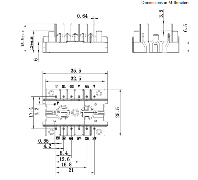 Максимальное рабочее напряжение коллектора-эмиттера достигает 600 В, что позволяет использовать модуль в средних и высоковольтных цепях. Номинальный ток коллектора составляет 35 А, а импульсный - до 40 А, что подходит для работы с мощными нагрузками. Рекомендуемое напряжение затвора относительно эмиттера варьируется в пределах ±20 В, что обеспечивает надежное переключение.