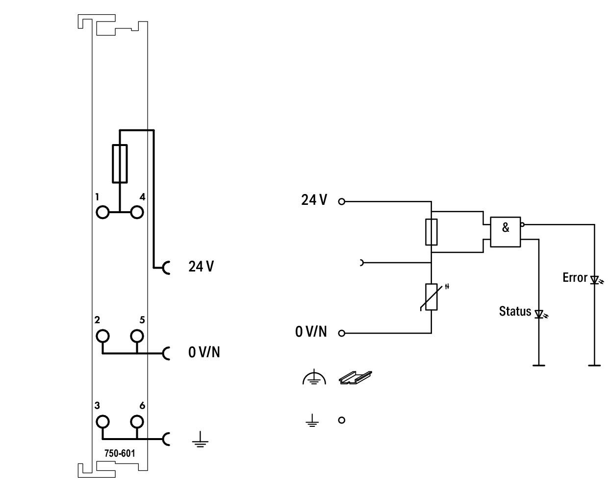 Модуль 750-601 является системным компонентом, предназначенным для формирования безопасного сегмента питания силовой шины. Принцип работы устройства заключается в приеме внешнего напряжения 24 В и его трансляции на ножевые контакты питания для соседних модулей. Устройство оснащено выдвижным держателем для стандартного плавкого предохранителя (5x20 мм), что обеспечивает надежную защиту группы модулей от короткого замыкания в полевой сети. Состояние предохранителя контролируется электроникой: при срабатывании защиты загорается красный светодиод, а информация об ошибке передается по шине данных. Модуль обеспечивает высокую помехозащищенность системы. Пружинные зажимы гарантируют надежность подключения силовых кабелей. Устройство необходимо для разделения групп модулей с различными требованиями к питанию или для добавления дополнительной мощности в систему.