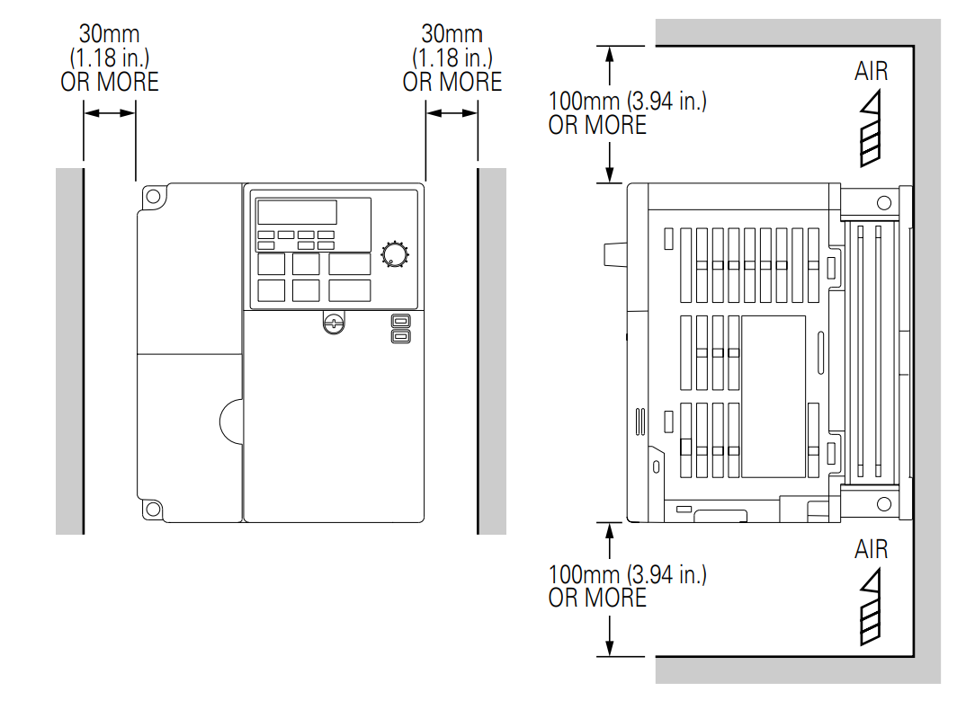 Преобразователь монтируется вертикально на негорючий материал в шкафу с вентиляцией, где температура воздуха на входе не превышает 45°C для IP20. Размеры компактные - примерно 71x128x51 мм ширина x высота x глубина, масса около 0,6 кг, что упрощает интеграцию в ограниченное пространство. Подключение основного цепи: вход R/L1-S/L2 однофазный 200-240 В 50/60 Гц, выход U/T1-V/T2-W/T3 трехфазный переменный ток до 230 В 0-400 Гц. Есть клеммы для тормозного резистора B1-B2 и DC-реактора +1/+2. Управляющая цепь включает многофункциональные входы S1-S7 (фотоэлектрическая развязка 24 В), аналоговые входы для опорной частоты FR 0-10 В или 4-20 мА, выходы реле MA-MB-MC и фотокопплеры P1-P2, плюс MEMOBUS/RS-485 для связи.